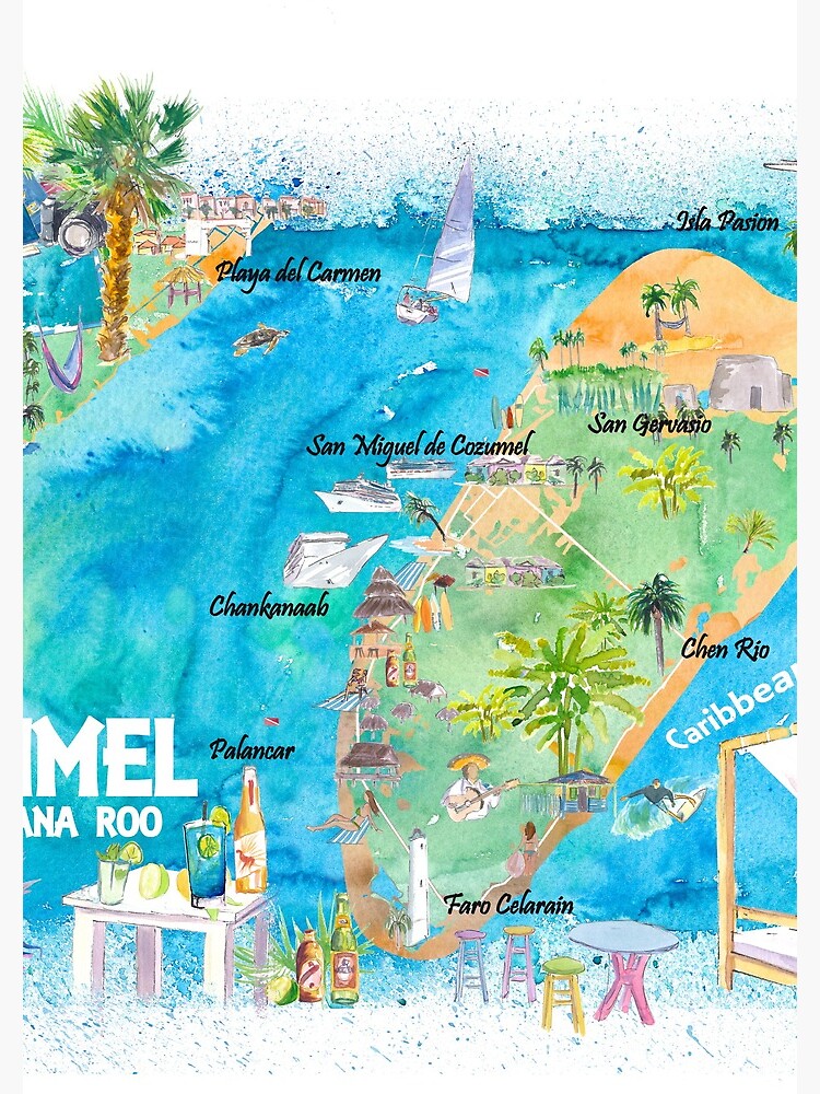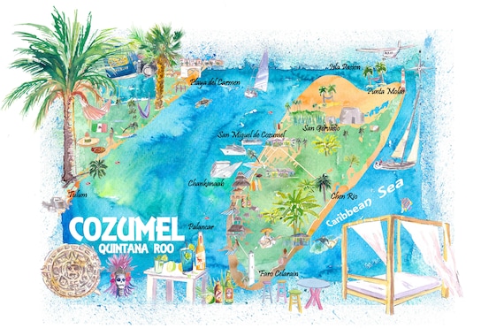 Cozumel Quintana Roo Mexico Illustrated Travel Map with Roads and